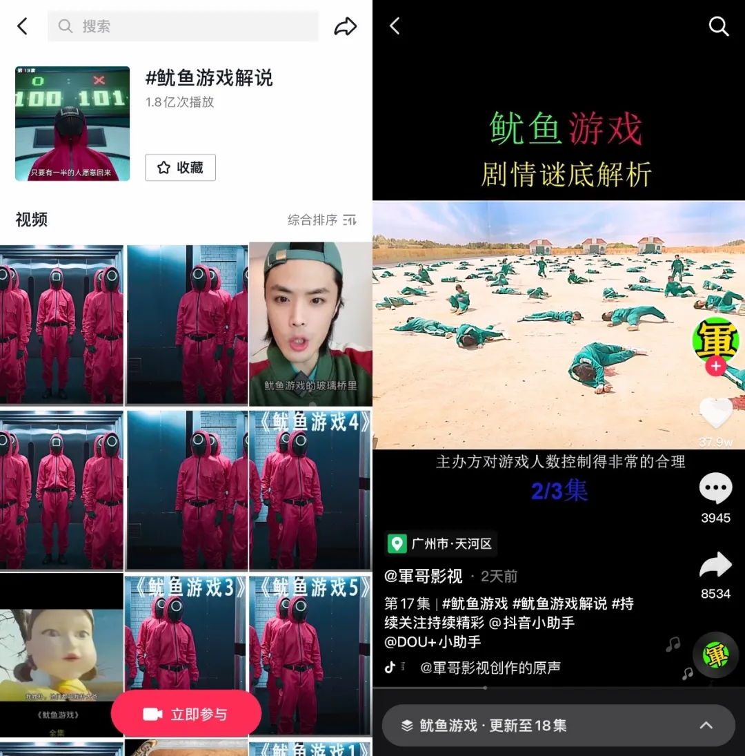 “《鱿鱼游戏》开播前,所有影视UP主都能预判到这部剧集适合解说,最后的火爆程度虽不然清楚,但这肯定是必须肝的一部剧集。”一个新人抖音影视UP主向壹娱观察分享道,“我曾经做过一期《大逃杀》视频,反响很好,血腥、重口味、猎奇元素、惊悚悬疑、极端思维......这些几乎是粉丝最爱看的题材作品。”