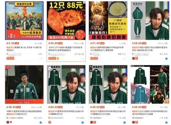 《鱿鱼游戏》文化现象的狂热释出,其相关衍生品也在如海外一样,在国内购物平台同样热销起来。一位浙江商家向分享:“由于参赛者的服装和咱们的‘中国’服装基本完全一样,只是把文字改为编号就行了,很容易转化,在剧集开播前已经预判了可能要火,就订制200套,不到一周的时间就卖完了。最近寻问的人也特别多。”