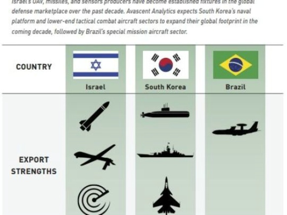 取而代之的是,西方武器出口国面临的最大挑战将来自韩国、巴西和以色列,而这三个国家也各有优势。