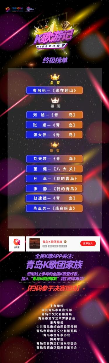 自9月10日“k歌游记”在线上唱响以来,就得到了来自全国各地以及海外K歌爱好者的支持,来自全国各地、各年龄层、各职业的音乐爱好者们积极参与,参与互动点评点赞和转发助力等上百万数据总和,掀起传唱青岛原唱歌曲热潮,用青岛之歌传唱青岛城市之美。