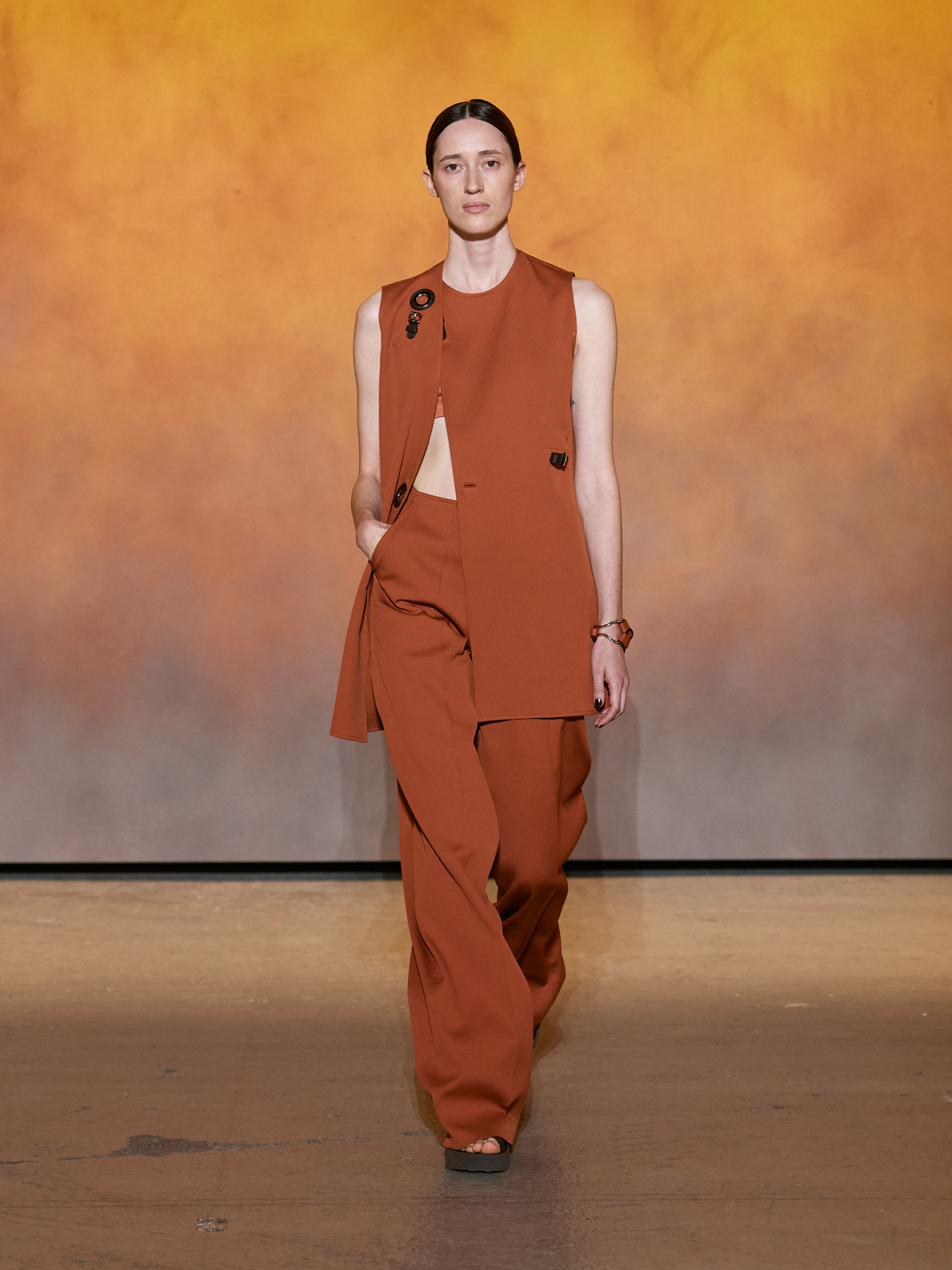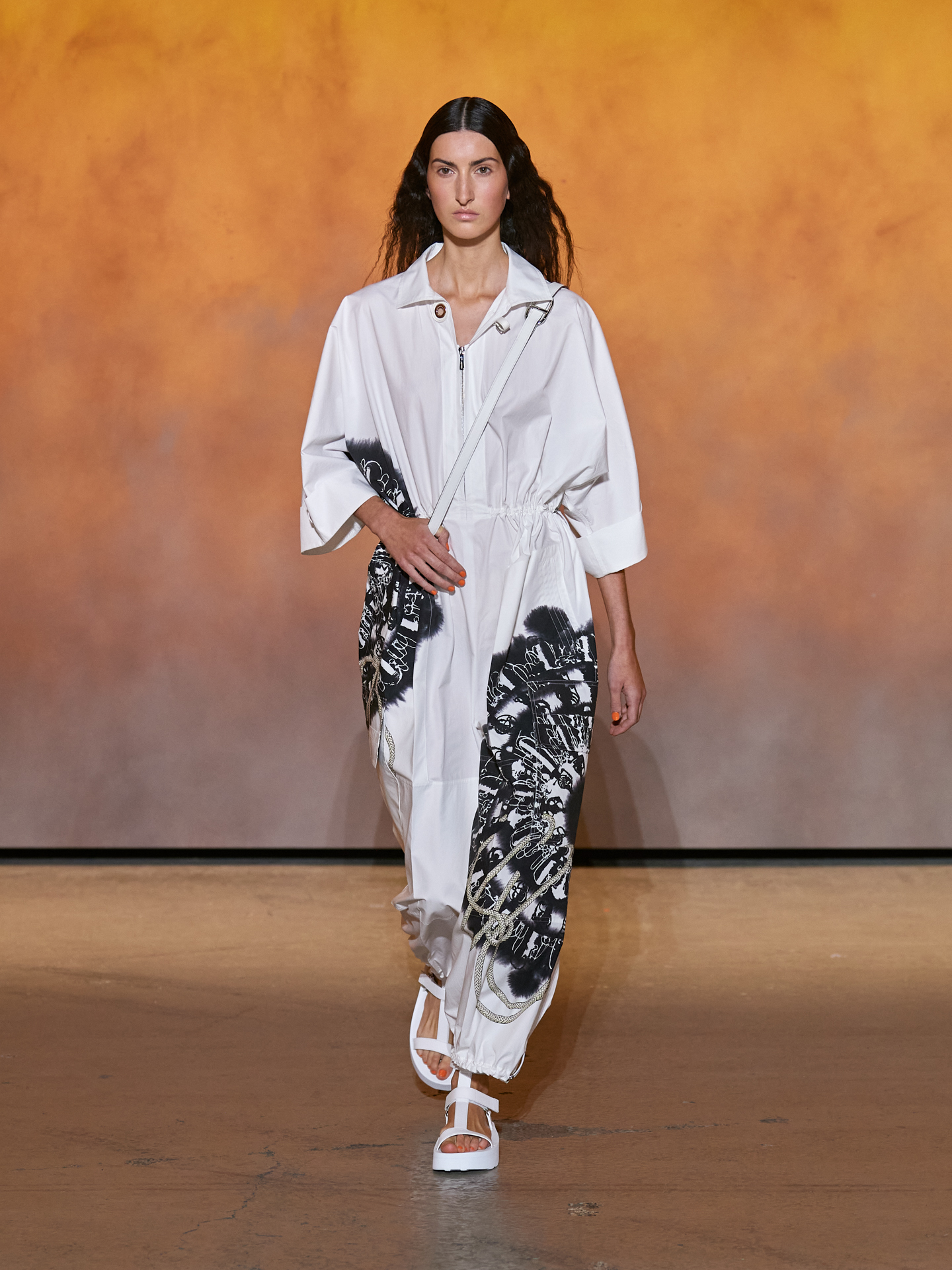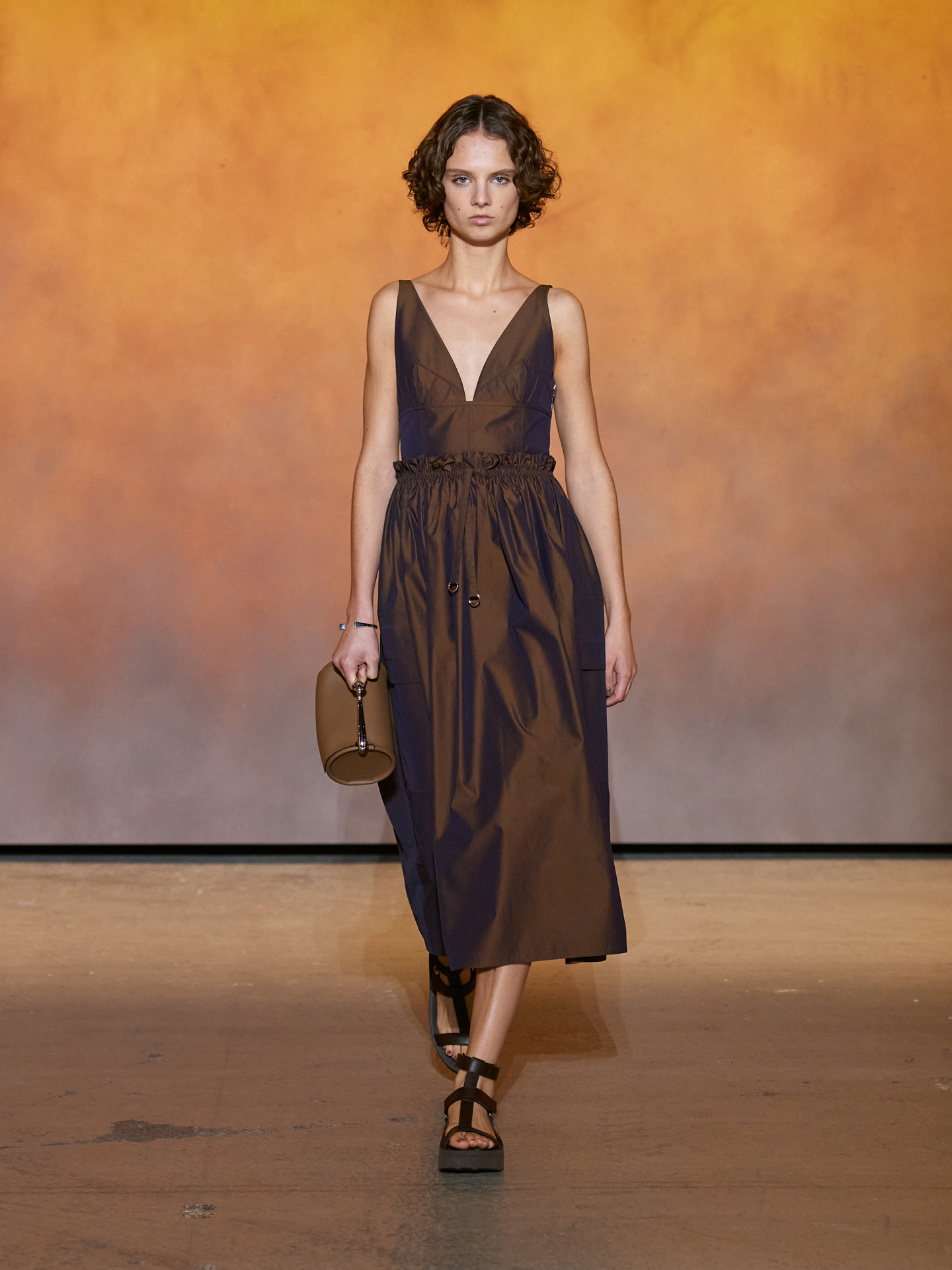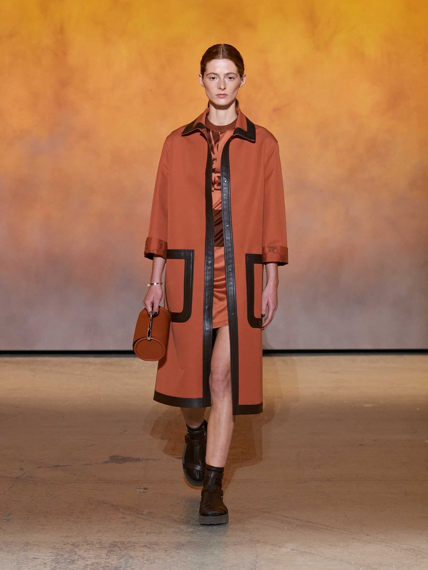 本季秀场的设计灵感源自地平线与暖阳,背景圆弧形的设计象征着向天际无尽延伸的悠远地平线。暖阳的色调展现出生之气息,璀璨又深邃,并且衬托出迷人的肌肤。风衣、短裤和高腰抽绳长裤依然是本季的重头戏,别致的剪裁和材质勾勒出勾勒身体曲线,似乎能摆脱引力束缚,翩然起舞。