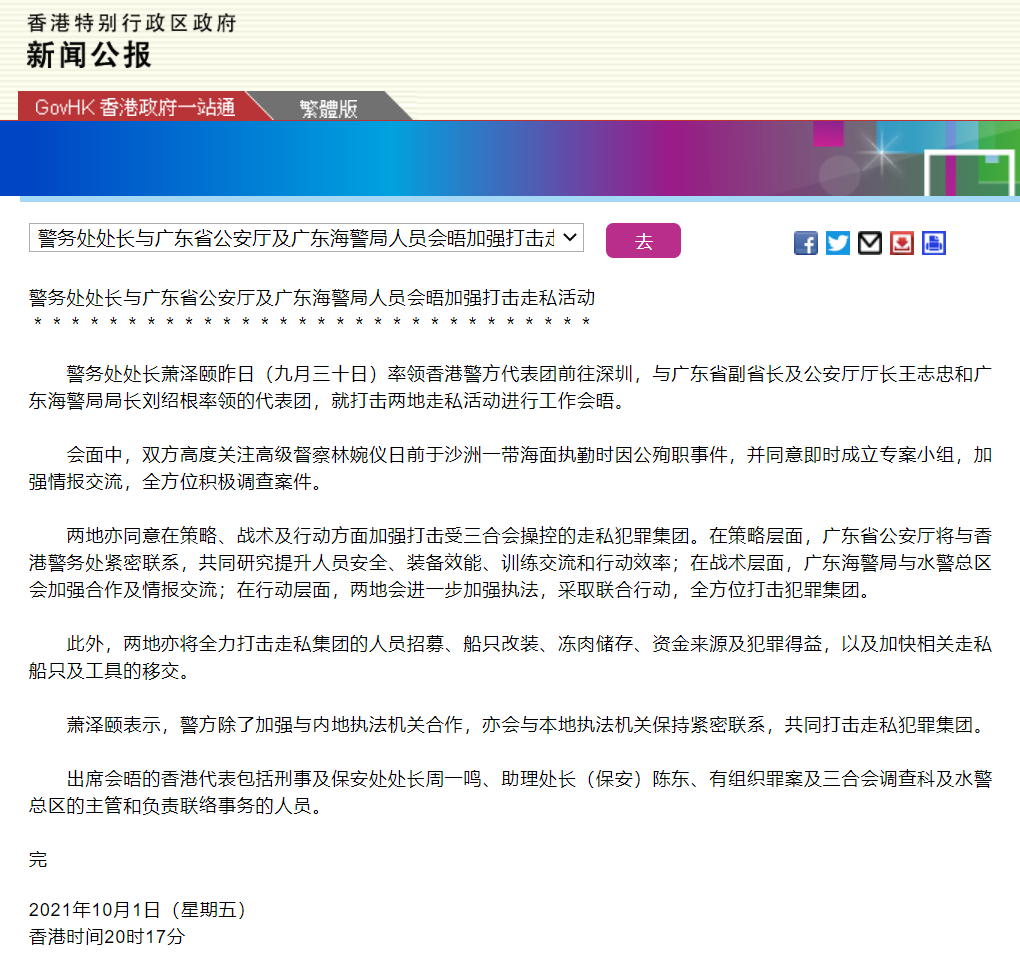 10月1日,香港特区政府网发布新闻公报称,香港警务处处长萧泽颐昨日率领香港警方代表团前往深圳,与广东省副省长及公安厅厅长王志忠和广东海警局局长刘绍根率领的代表团,就打击两地走私活动进行工作会晤。