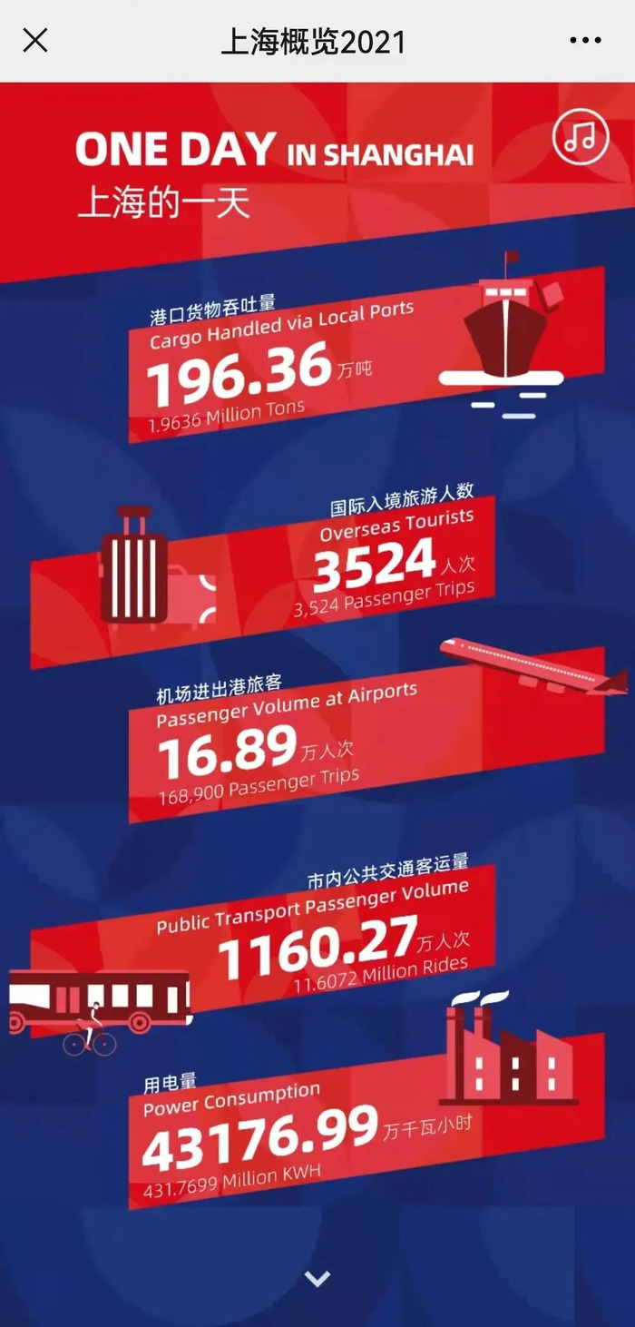 中英双语版的H5精选《上海概览2021》内容,以上海打造“五大中心”和人文生态之城、国际文化大都市建设、协同长三角发展为主线,提炼出“上海一日”经济发展数据、中国国际进口博览会、五个新城、一江一河、浦东新区打造社会主义现代化建设引领区等主要板块和内容数据,通过“上海发布”微信、微博、抖音、快手等新媒体平台发布。