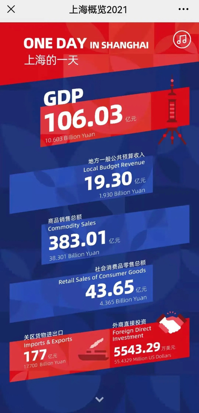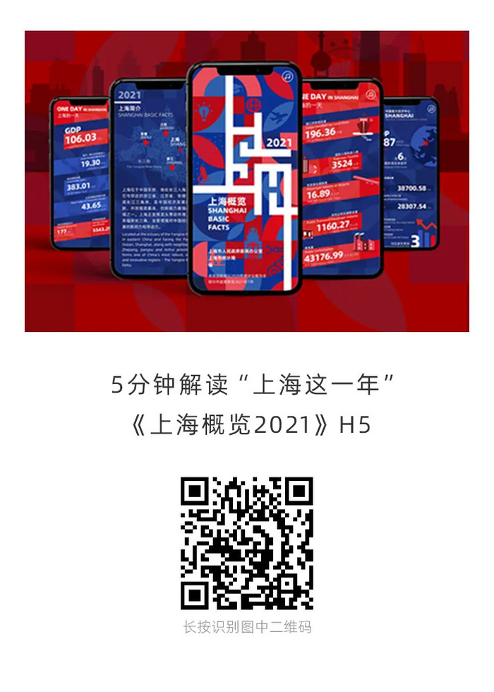 上海市人民政府新闻办公室出品的这款H5作品由官方出版物《上海概览2021》衍生而来。数据基于上海市统计局发布的2020年上海统计公报和部分2021年重大新闻事件。