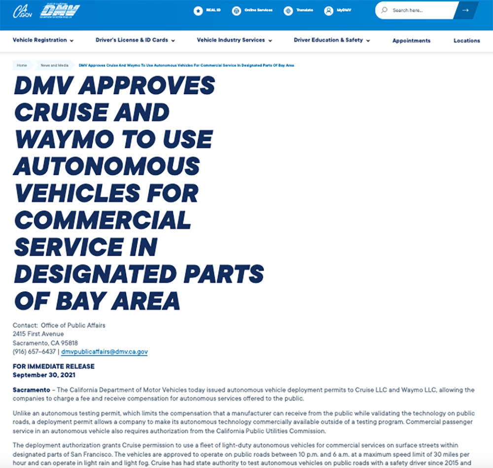 车东西10月2日消息,美国时间9月30日,美国加州机动车管理局(以下简称DMV)向Cruise和Waymo颁发了无人驾驶出租车收费许可,这意味着Cruise和Waymo可以在加州部署商业化的无人驾驶出租车。