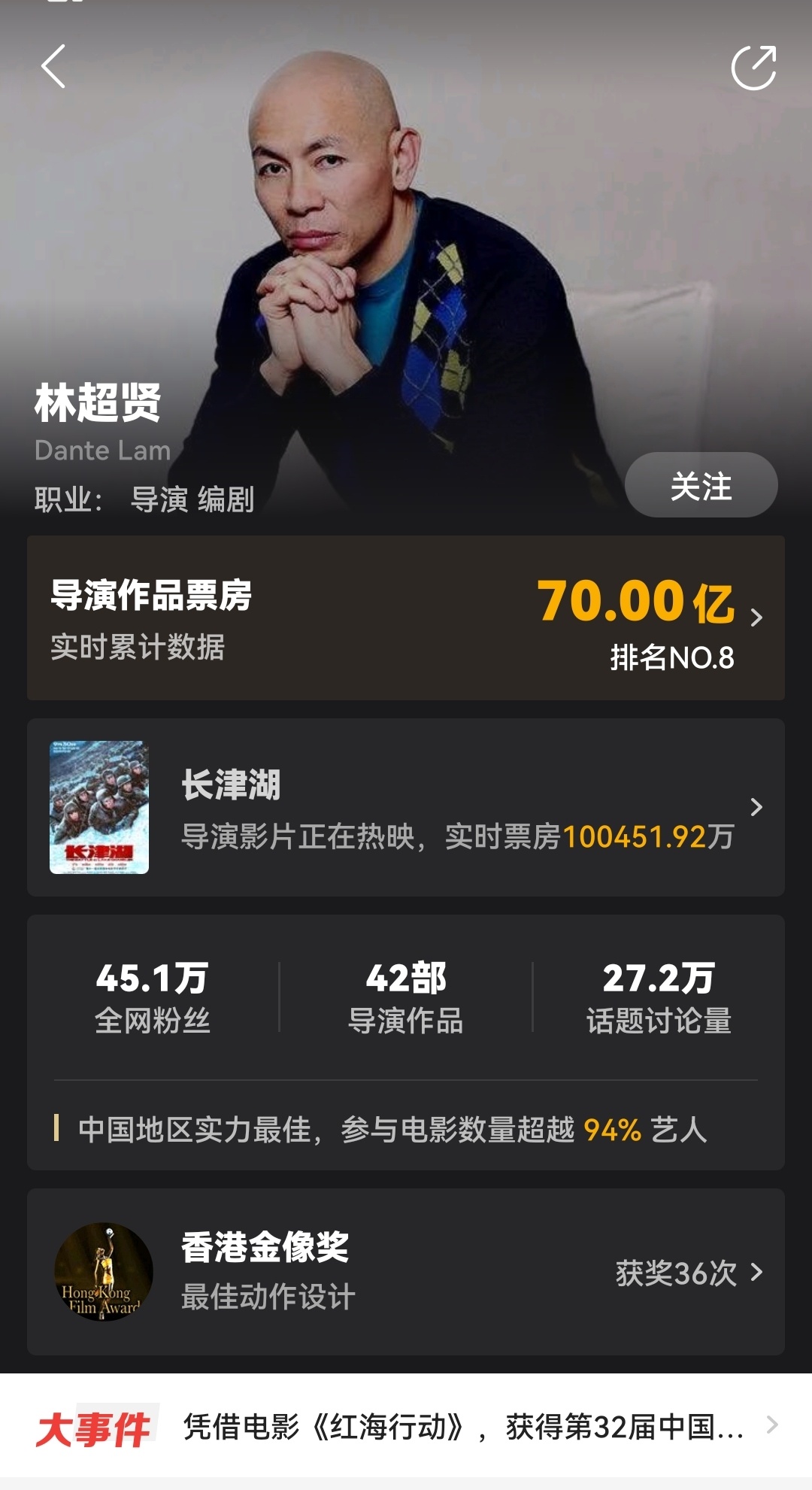 据@猫眼专业版 微博消息,10月2日19时45分,《长津湖》票房达10.04亿,助林超贤导演票房破70亿。