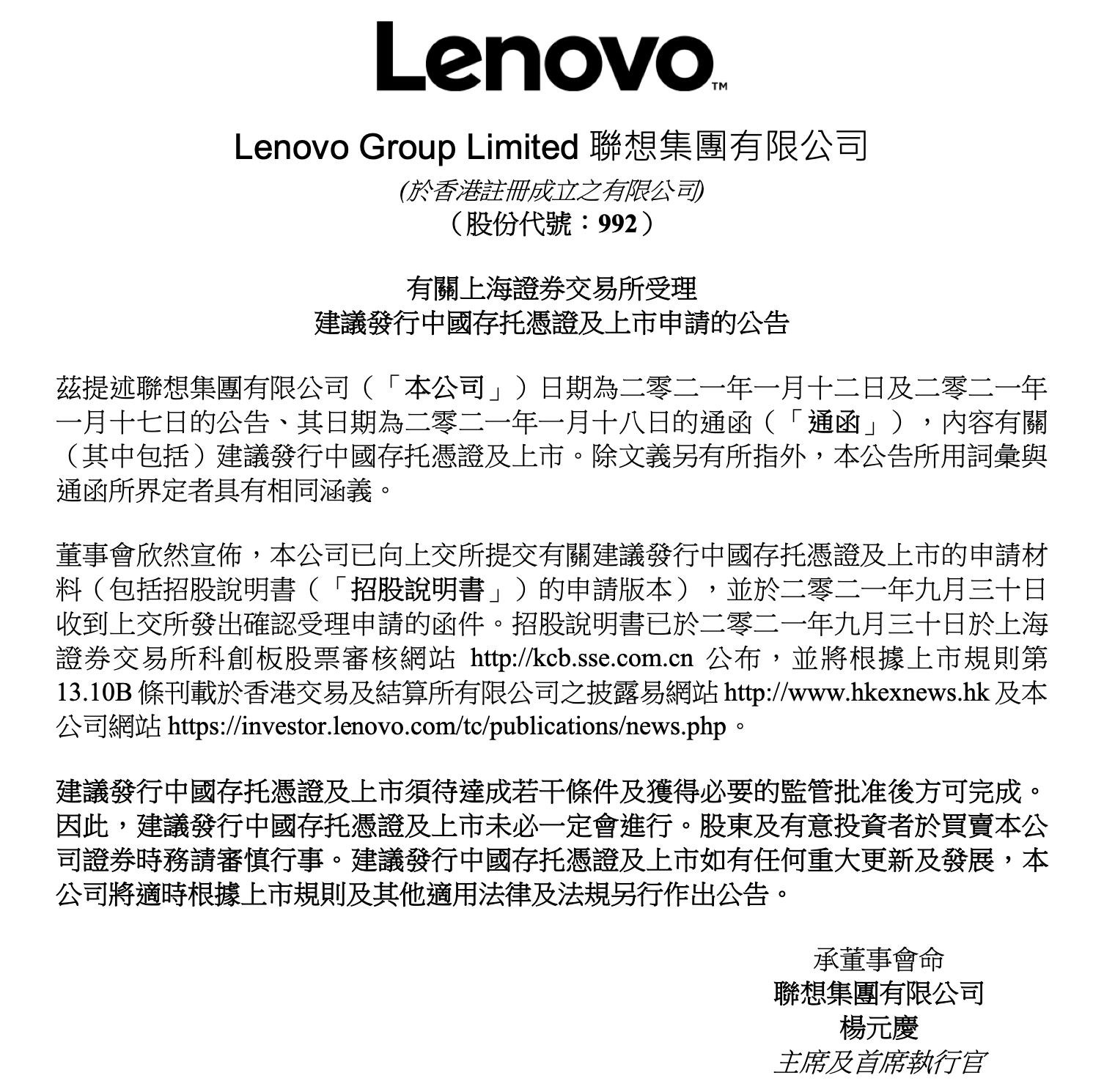10月4日,联想集团在港交所公告,公司已向上交所提交有关建议发行中国存托凭证及上市的申请材料(包括招股说明书的申请版本),并于2021年9月30日收到上交所发出确认受理申请的函件。