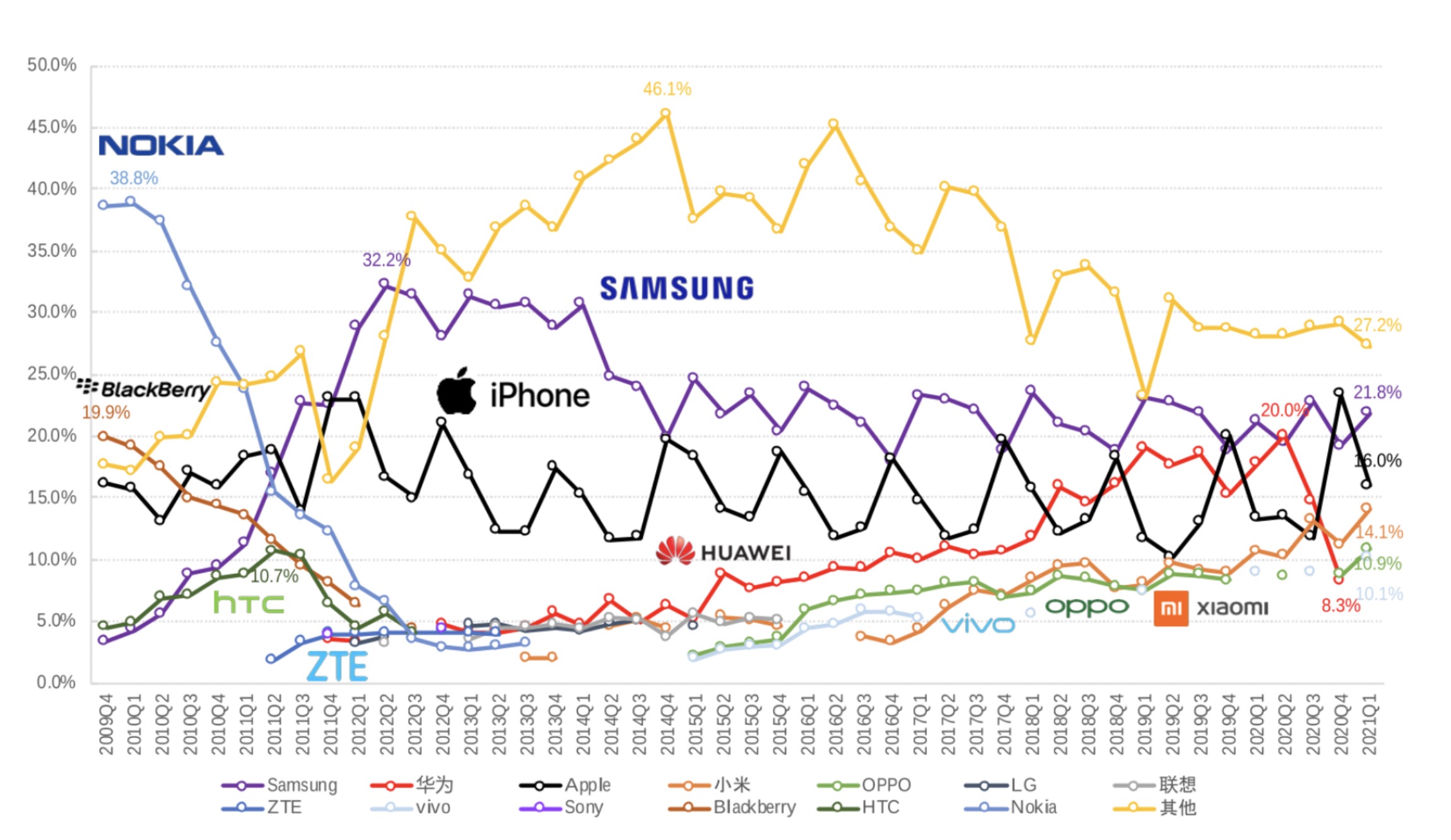 IDC的一份报告显示,2011年至2018年,全球手机市场中,三星和苹果市场份额基本稳定在第一与第二名。但2018年以后,以华为为代表的国产手机厂商迅速崛起,市场份额一路向苹果赶超。
