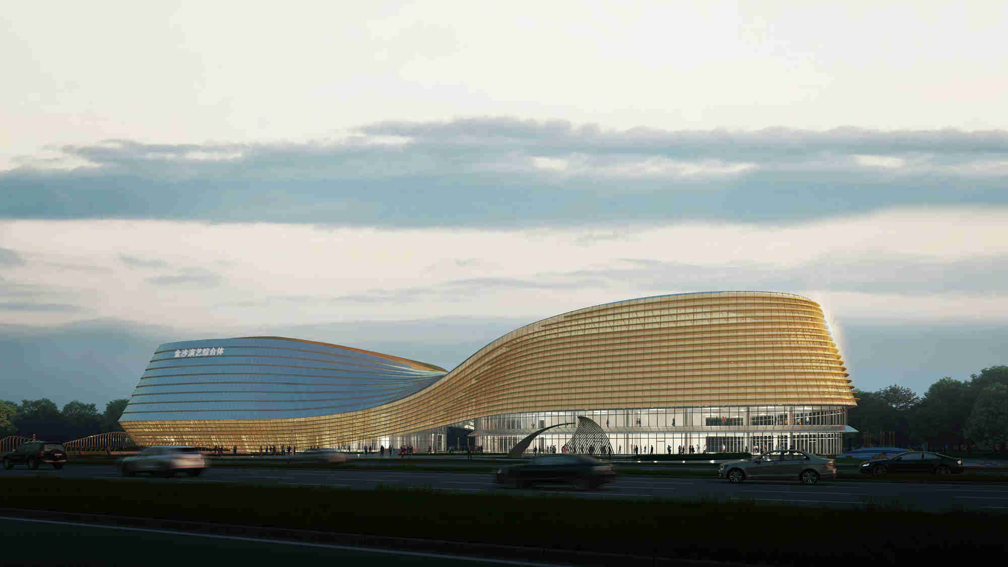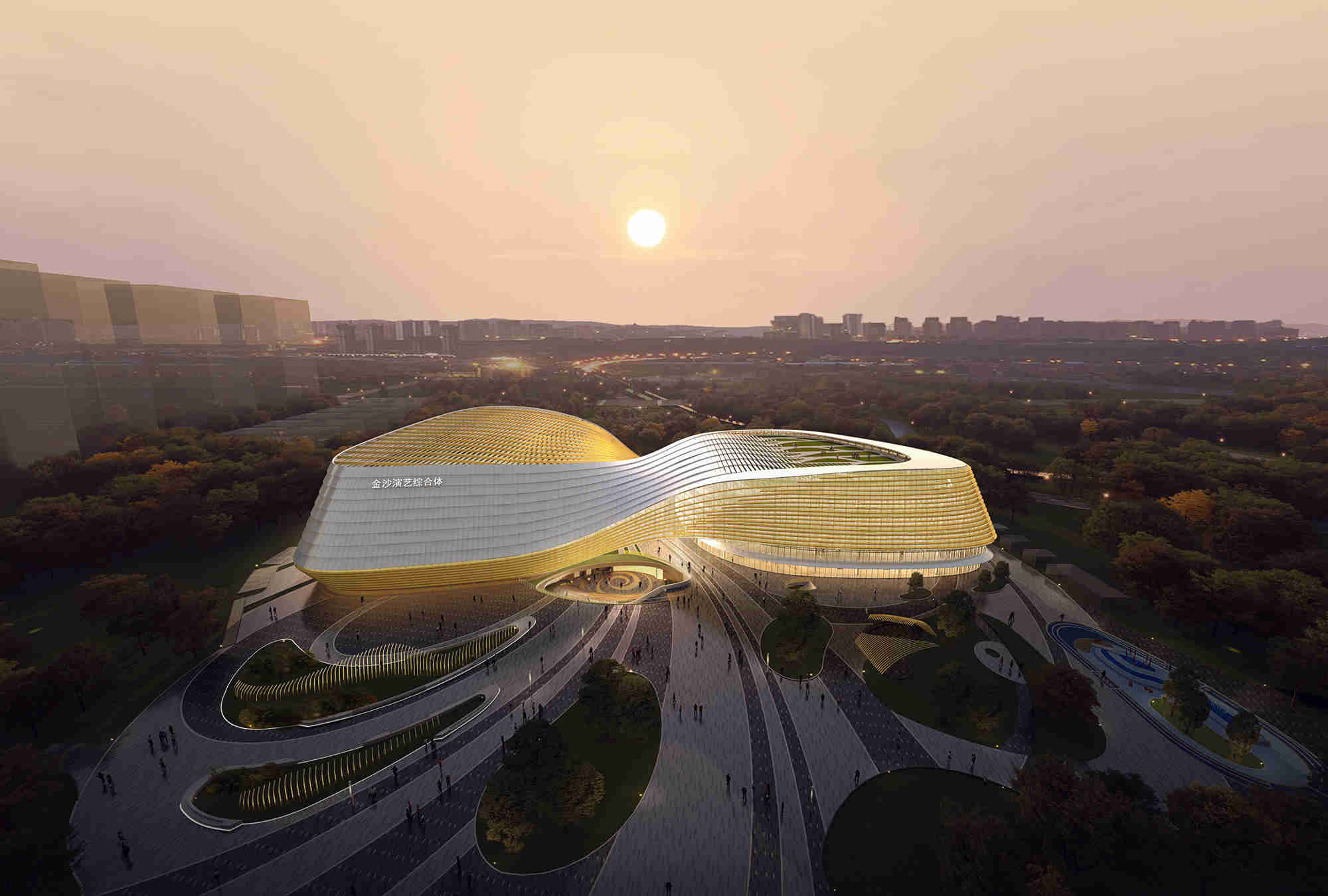 金沙演艺综合体项目是由成都文旅集团与中建三局携手打造的文旅项目,也是成都市住建局重点督办和指导的工程。位于成都市三环路西四段东侧、摸底河北侧,坐拥三个公园,磨底河穿流而过。总建筑面积6.7万平方米,总投资11.07亿元。项目主要由综合剧场、文化活动中心两部分组成,拥有一个可容纳1200人的甲级剧场、一个可容纳800人的电影院,设置空中书吧茶座、城市观景台、室外演出场地等,承担文化娱乐、艺术教育、体育健身等功能。