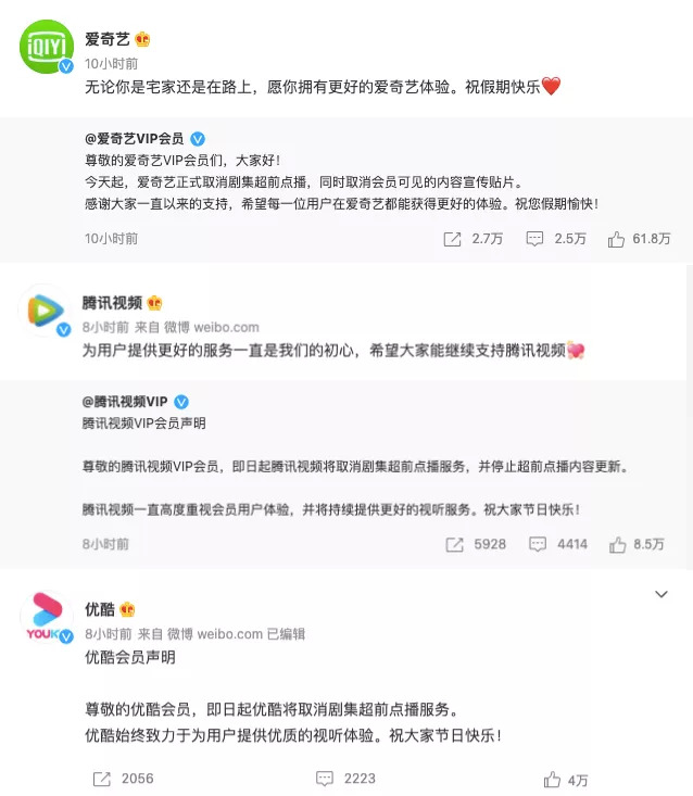 今天(10月4日)下午,爱奇艺VIP会员官方微博宣布正式取消剧集超前点播,同时取消会员可见的内容宣传贴片。随后,腾讯视频、优酷也在VIP会员的官博发表声明,取消剧集超前点播。截至稿前,四大长视频平台中仅有芒果TV仍在开启超前点播。