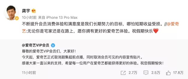 从单一的去广告,到专属的VIP内容,再到超前点播,视频平台在会员领域一直以做加法的方式来探索更多维的打法。如今三大平台罕见地做了减法,取消了“超前点播”这一付费业务,从短期来看,一定程度上会直接影响到平台剧集相关的付费收益。对此,爱奇艺创始人、CEO龚宇在微博回应:“不断提升会员消费体验和满意度是我们长期努力的目标,哪怕短期收益受损。”