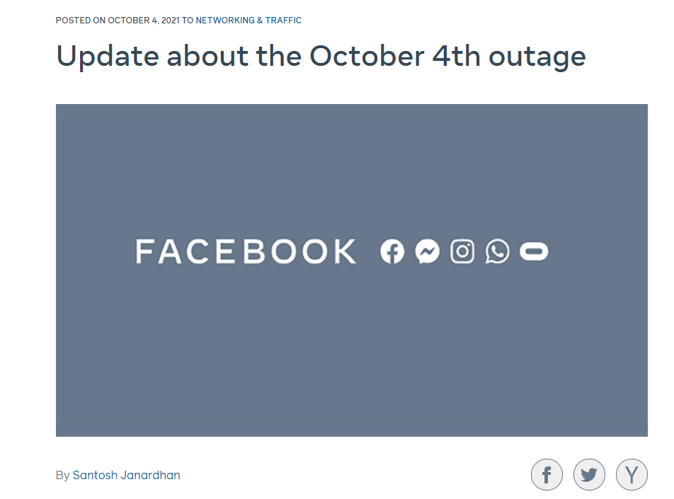 声明中称:“据我们工程团队的了解,协调数据中心之间网络流量的主干路由器的配置变化导致了通信中断,由此对我们数据中心的通信方式产生了连带影响,使我们的服务陷入停顿。”