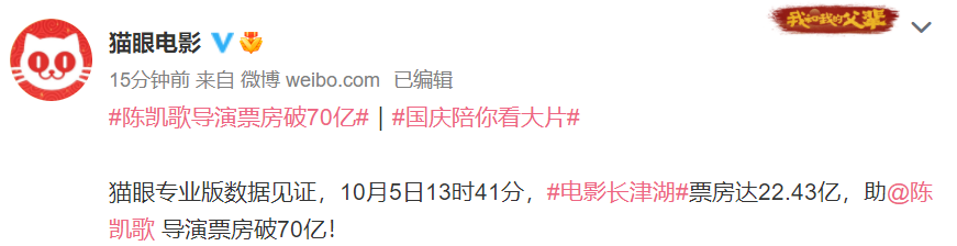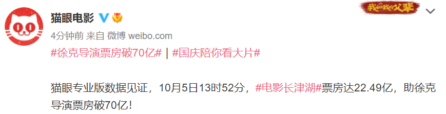 据@猫眼电影 微博消息,猫眼专业版数据显示,10月5日13时41分,电影《长津湖》票房达22.43亿,陈凯歌导演票房破70亿。10月5日13时52分,电影《长津湖》票房达22.49亿,徐克导演票房破70亿。