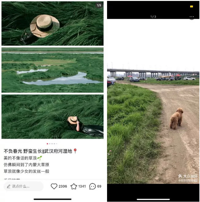 比如,在武汉府河湿地,小红书博主个个都能拍出春日草地大片,甚至还可以席地美美地吃着野餐火锅;同一地点到了大众点评上,就变成了杂草堆加土路和野钓集中地。