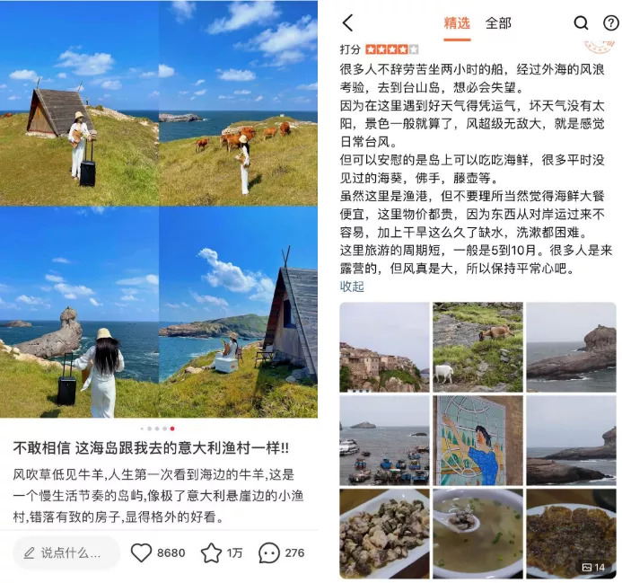 比如位于福建省福鼎市的台山列岛在两个平台的画风也是天壤之别。这个小众海岛被小红书博主称为“像极了意大利悬崖边的小渔村”,图片里是湛蓝的天空、碧绿的海水、错落有致的房子、葱郁的草地和牛羊,让人看了很难不心动。