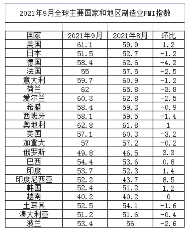 10月6日,中国物流与采购联合会官网发布数据显示,2021年9月份全球制造业PMI较上月回落0.1个百分点至55.6%,连续4个月环比下降。分区域看,9月份,欧洲制造业PMI较上月明显回落,非洲制造业PMI较上月稍有回落,亚洲制造业PMI较上月微幅回升,美洲制造业PMI较上月明显回升。从指数变化看,9月份,全球制造业增速较上月略有回落,波动幅度不大。欧洲制造业增速较上月明显放缓,亚洲和非洲制造业增速波动不大,美洲制造业增速较上月有所加快。