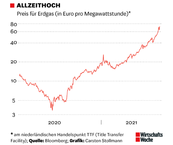 自今年年初以来,天然气价格就在不断上涨。据彭博社数据,欧洲天然气价格从今年1月的不到26欧元/兆瓦时,上涨到了9月20日的64.46欧元/兆瓦时,涨幅为223%。9月25日的ICE期货交易所,其价格更是突破了100欧元/兆瓦时,创造了历史记录。