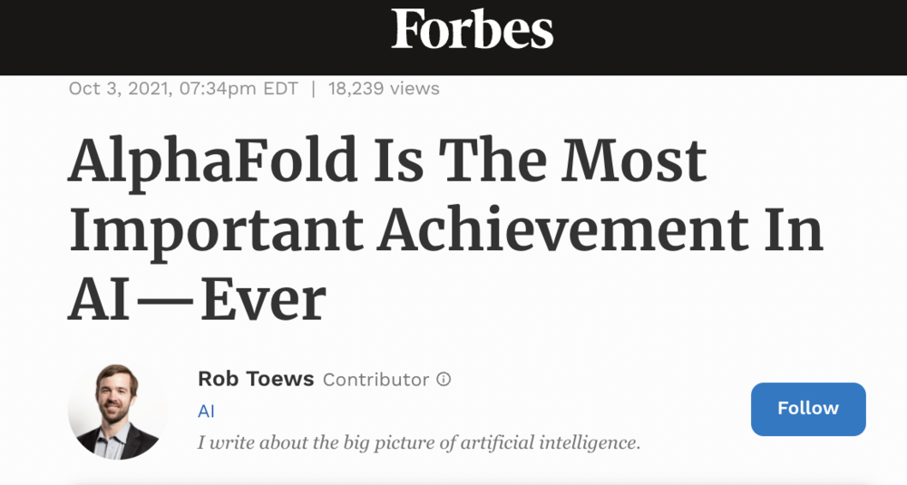 因此,当他们公布自己的人工智能模型AlphaFold通过蛋白质数据库的数据训练,已经预测出蛋白质3D形状时,这个系统不仅被纽约时报、福布斯等杂志称为“一流的科学成就”,还被看作是“一个历史性的时刻”。