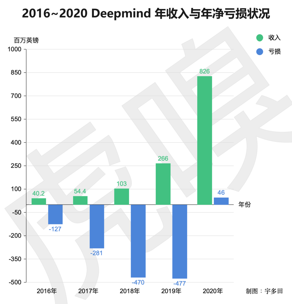 与大多数在2019年进入萧条期和死前挣扎期的国内人工智能公司一样,在更看中自由市场商业化落地的欧美,Deepmind从2016年~2019年共计亏损13.55亿英镑(这还不算上收购的6亿美元,还免除了2019年15亿美元债务),约合人民币118.5亿元(18.38亿美元)。
