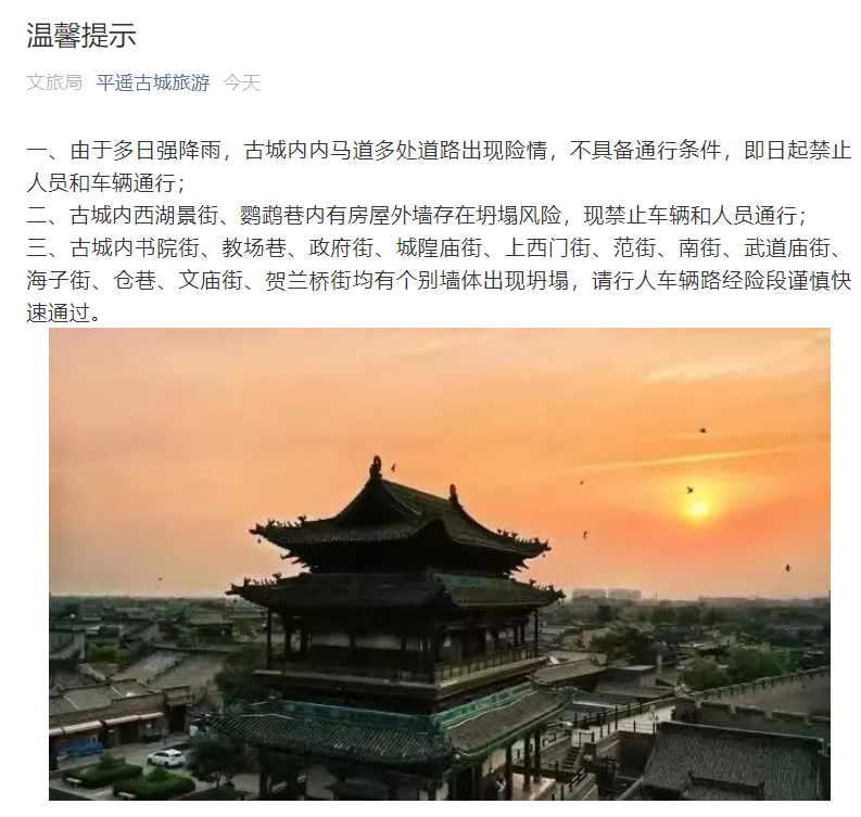 10月7日,山西平遥县旅游局发布温馨提示,由于多日强降雨,古城内内马道多处道路出现险情,不具备通行条件,即日起禁止人员和车辆通行;古城内西湖景街、鹦鹉巷内有房屋外墙存在坍塌风险,现禁止车辆和人员通行;古城内书院街、教场巷、政府街、城隍庙街、上西门街、范街、南街、武道庙街、海子街、仓巷、文庙街、贺兰桥街均有个别墙体出现坍塌,请行人车辆路经险段谨慎快速通过。