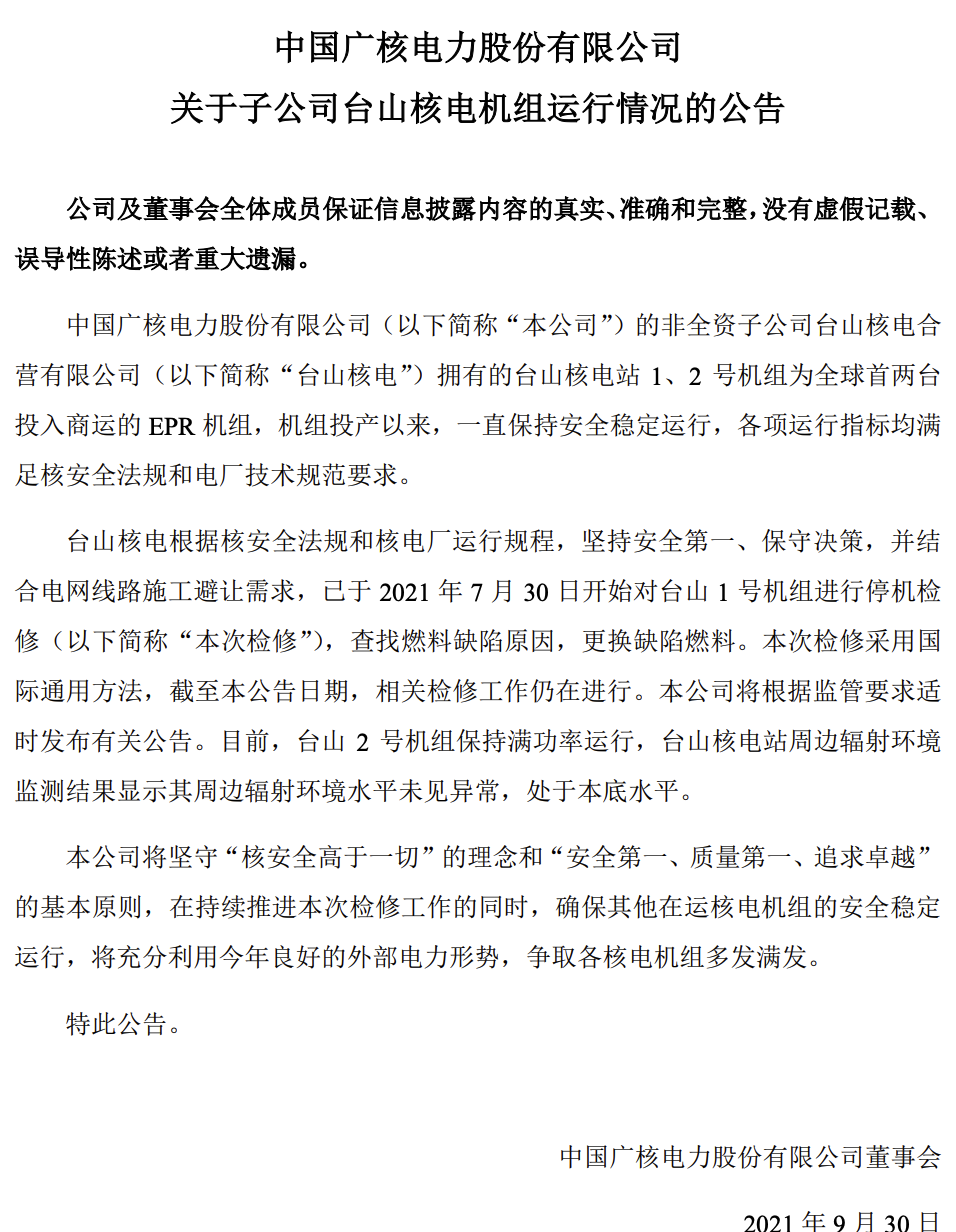 中国广核10月7日发布公告称,,本公司的非全资子公司台山核电根据核安全法规和核电厂运行规程,坚持安全第一、保守决策,并结合电网线路施工避让需求,已于2021年7月30日开始对台山1号机组进行停机检修,查找燃料缺陷原因,更换缺陷燃料。本次检修采用国际通用方法,截至本公告日期,相关检修工作仍在进行。本公司将根据监管要求适时发布有关公告。目前,台山2号机组保持满功率运行,台山核电站周边辐射环境监测结果显示其周边辐射环境水平未见异常,处于本底水平。