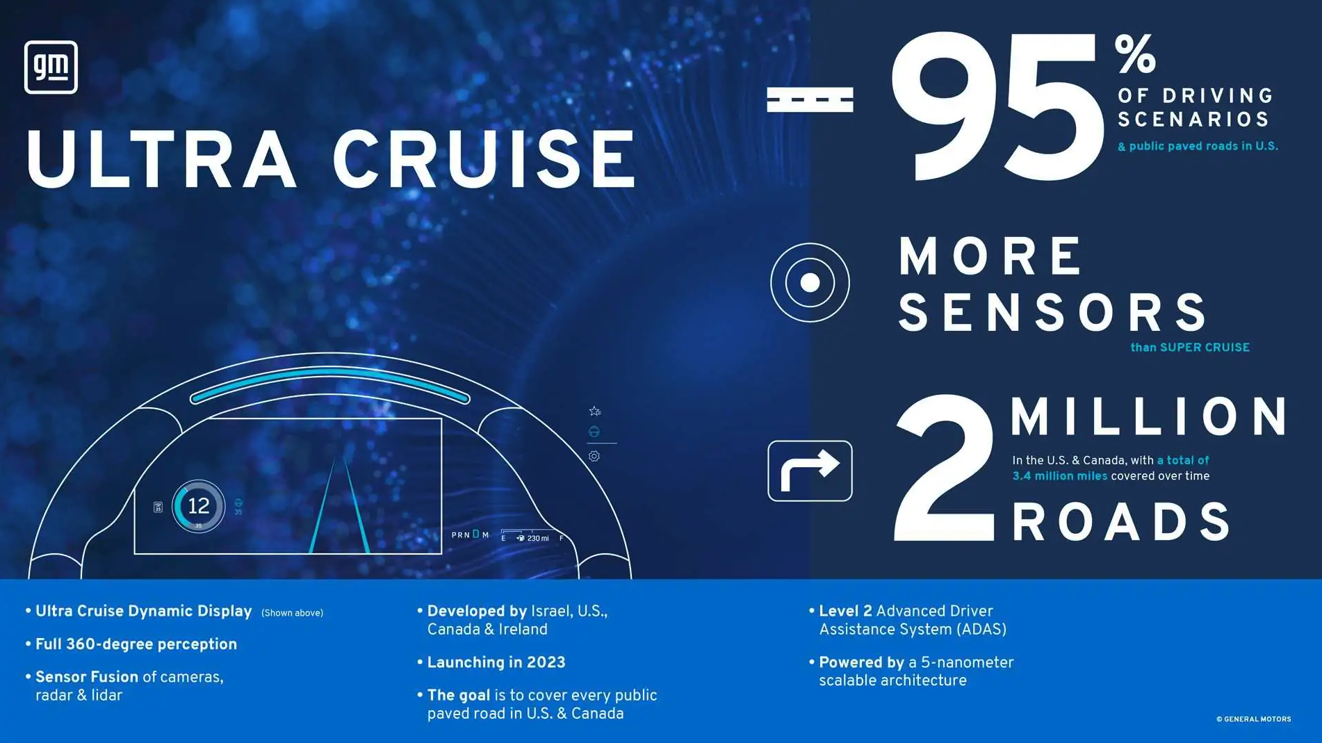 通用汽车透露,“Ultra Cruise”能在美国和加拿大超过200万英里的公共道路上运行,且可运行在95%的驾驶场景内,最早搭载时间为2023年,目标产品是集团内少数高端车型。