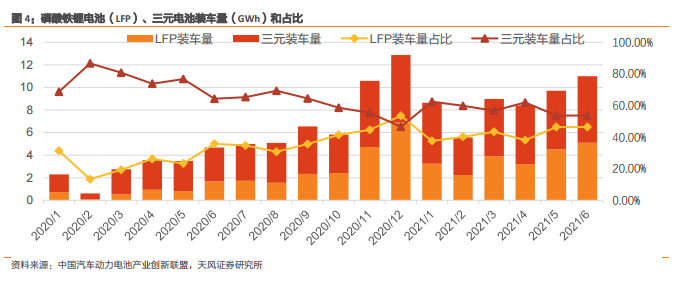 中国汽车动力电池产业创新联盟的数据显示,2021年1-7月,我国动力电池产量累计92.1GWh,同比累计增长210.9%。其中三元电池产量累计44.8GWh,占总产量48.7%,同比累计增长148.2%;磷酸铁锂电池产量累计47.0GWh,占总产量51.1%,同比累计增长310.6%。磷酸铁锂产量及占比超过三元,装机占比也不断提升。宁德时代的曾毓群也明确表态,未来 3—4 年,宁德时代将逐渐增加磷酸铁锂电池的产能占比,减少三元锂电池的产能。