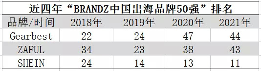 另一方面,据2018年“BRANDZ中国出海品牌50强”榜单显示,Gearbest位列中国品牌出海综合排名第22名,ZAFUL位列第34名。而如今被称为跨境双子星之一的SHEIN,当时排名第24位。
