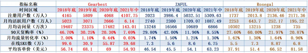 反观ZAFUL和Rosegal,虽然受环球易购整体债务危机导致银行授信降低、现金流紧张的影响,在同一时期各项经营数据也出现不同程度的下滑,但波动幅度明显小于Gearbest。尤其是“平均客单价”这一指标,两个服装独立站都呈现稳步上升态势。