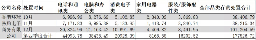 2020年,环球易购第三次由于存货的问题吃瘪,这次直接把环球易购亏到资不抵债。跨境通公告显示,截至2020年12月31日,环球易购总资产15.84亿元,总负债33.38亿元,净资产为-17.54亿元,净利润为-29.53亿元。环球易购在2020年四季度中,累计报废了17.79亿的库存,并且处置金额为0元。