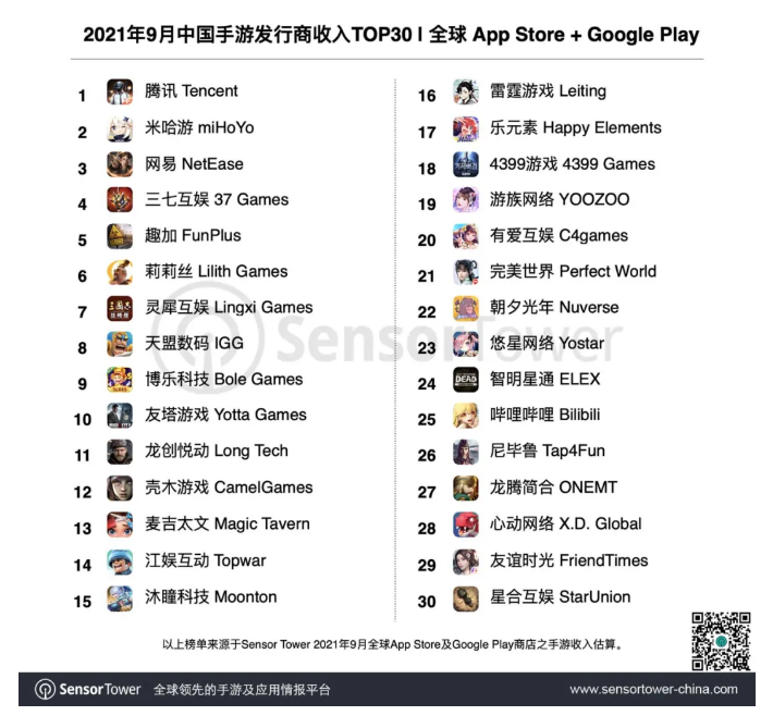 10月8日消息,据Sensor Tower商店情报平台,9月份中国手游发行商在全球App Store和Google Play的收入排名显示,由于近期腾讯、网易均有新品大作上市,米哈游《原神》迎来1周年庆,本期入围全球手游发行商收入榜TOP100的39家中国厂商,合计吸金近25.2亿美元,占全球TOP100手游发行商收入的41.5%,收入和占比均创历史新高。