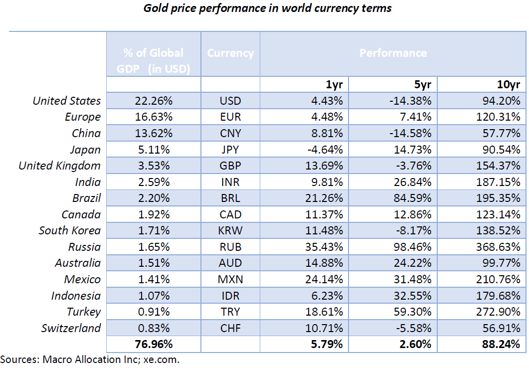下图显示了金价在过去1年、5年、10年内以不同货币计价的表现。换言之,可以看到不同货币在过去数年的贬值幅度。