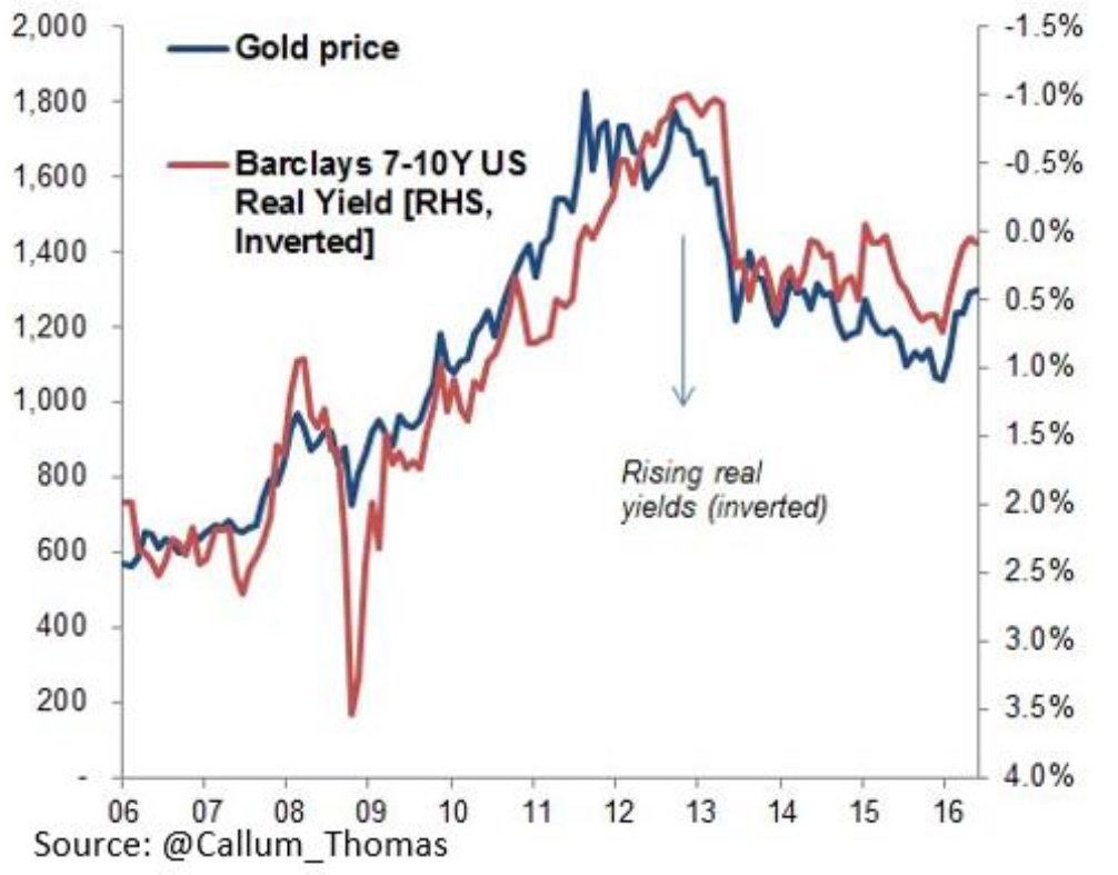 过去十年中,美国资产的收益率曲线和金价走势呈高度正相关关系。但当全球主权债券利率都日趋负值领域,情况会怎么样?