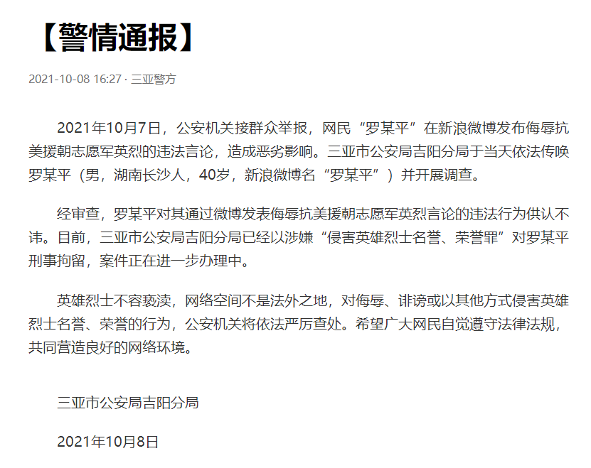 据“三亚警方”官方账号消息,2021年10月7日,公安机关接群众举报,网民“罗某平”在新浪微博发布侮辱抗美援朝志愿军英烈的违法言论,造成恶劣影响。三亚市公安局吉阳分局于当天依法传唤罗某平(男,湖南长沙人,40岁,新浪微博名“罗某平”)并开展调查。