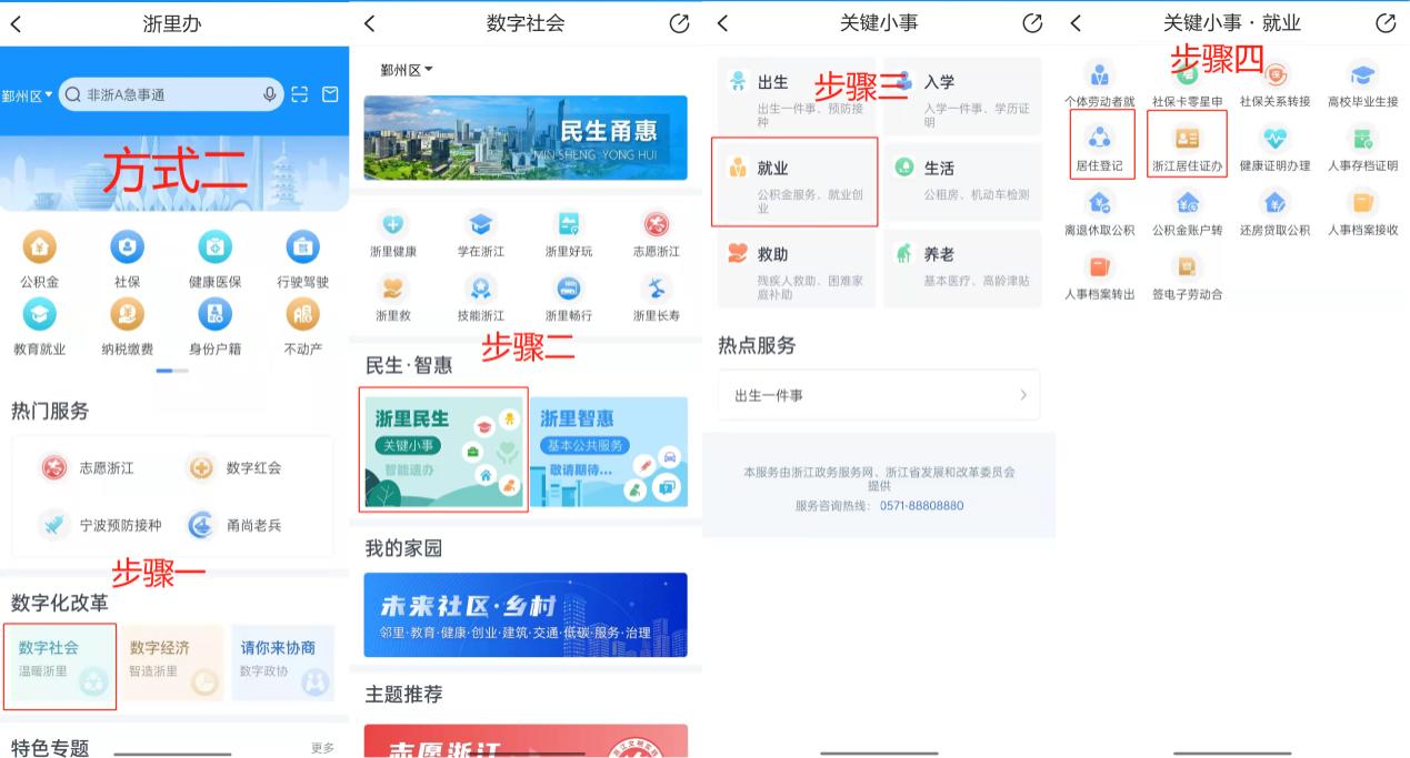 方式2:在“浙里办”首页上端找到“全省通办 一次办成”栏目点击进入,靠左下位置找到“数字社会”点击进入,从“浙里民生关键小事”进入后,找到“就业”栏目进入,点“浙江居住证办理”