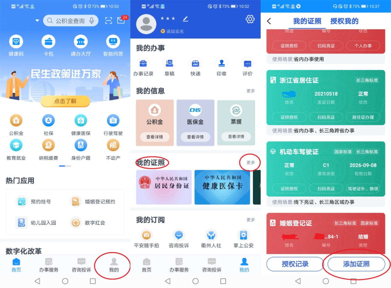 途径2:在“浙里办”APP右下角点击“我的”,在“我的证照”专栏点击“更多”,选择居住证并添加证照