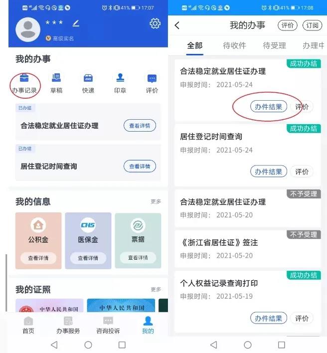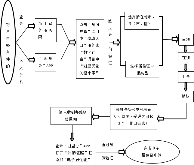 公安机关在2个工作日内完成审批、签发。申请人收到办结短信通知后,通过“浙里办”APP中的“我的证照”栏添加“电子居住证”,通过身份验证后即可完成电子居住证的申领。无法使用智能手机申领电子证照的老年人、未成年人等特殊群体,由本人到居住地公安机关办事窗口(即线下)办理相关业务,现场打印《浙江省居住证确认单》作为凭证使用。