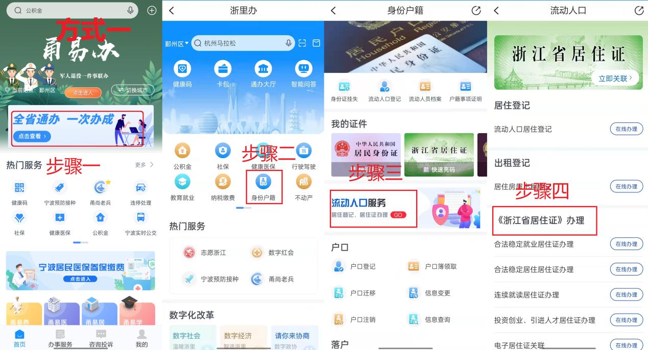 方式1:在“浙里办”首页上端找到“全省通办 一次办成”栏目点击进入,从“身份户籍”栏目点击进入后,找到并点击“流动人口服务”专栏