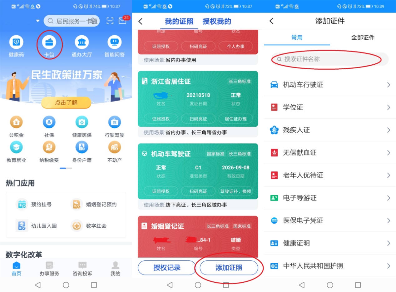 途径1:打开“浙里办”APP,点击“全省通办 一次办成”进入,找到“卡包”,点击进入后点击“添加证照”,在弹出的搜索栏里输入“居住证”,找到并完成添加