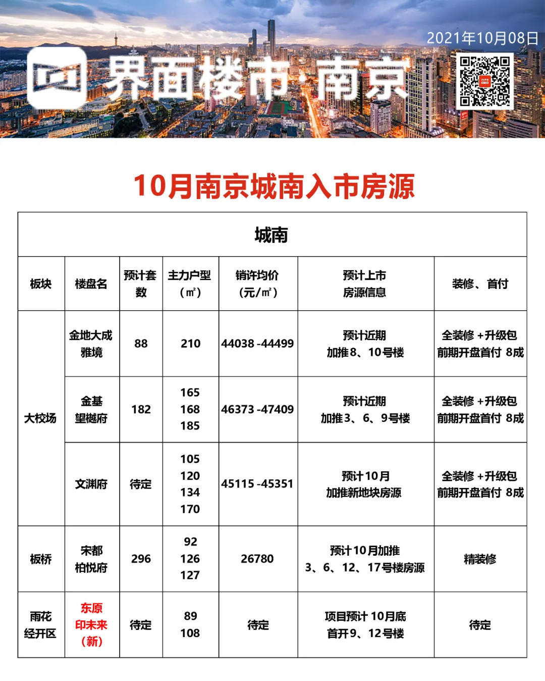 城南板块10月份预计有5个项目开盘,分别是大校场的金基望樾府、金地大成雅境、文渊府以及雨花经开区纯新盘东原印未来、板桥新城的宋都柏悦府。