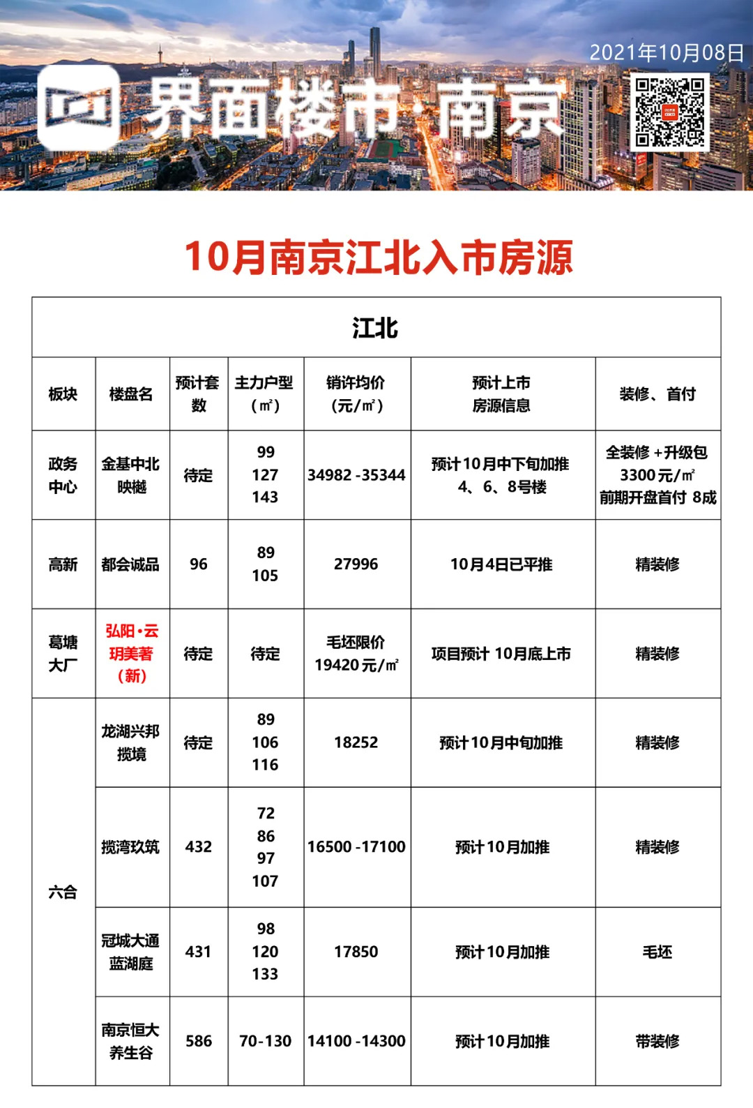 江北板块在9月集中爆发,引发了一批开盘潮,10月预计只有金基中北映樾加推,另外,六合有4家楼盘等待入市。