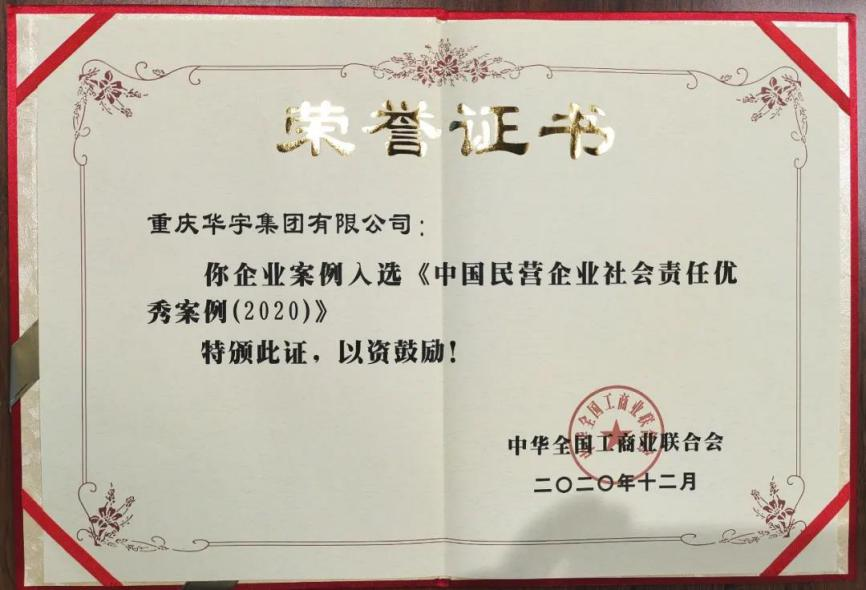 作为优秀民营企业,38年来,华宇集团积极践行社会责任,自觉履行民企义务,荣获2020中国民营企业社会责任优秀案例、2020年度重庆市脱贫攻坚工作先进集体、2020中国房地产最佳雇主企业等诸多殊荣,在人居营造、促进就业、社会公益、扶贫攻坚等事业上贡献着应有的力量。