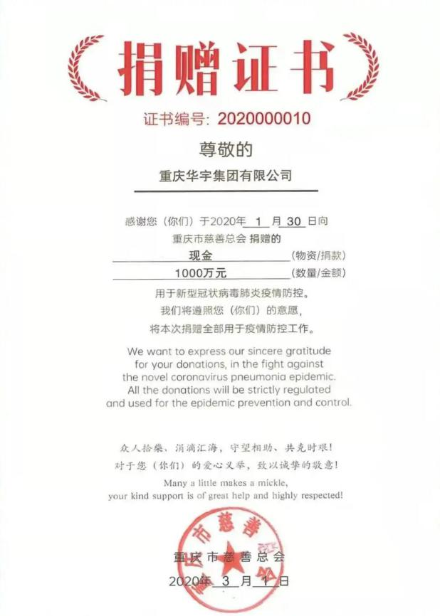社会公益及脱贫攻坚维度,华宇集团饮水思源,从捐赠1000万元防疫物资驰援武汉,到参与对口扶贫县建卡贫困户的精准帮扶工作,再出资5000万元与重庆市慈善总会联合设立“华宇爱心基金”建立扶贫济困新机制,华宇集团始终肩负责任,砥砺前行。截至日前,华宇集团累计社会慈善捐赠超4.4亿元。