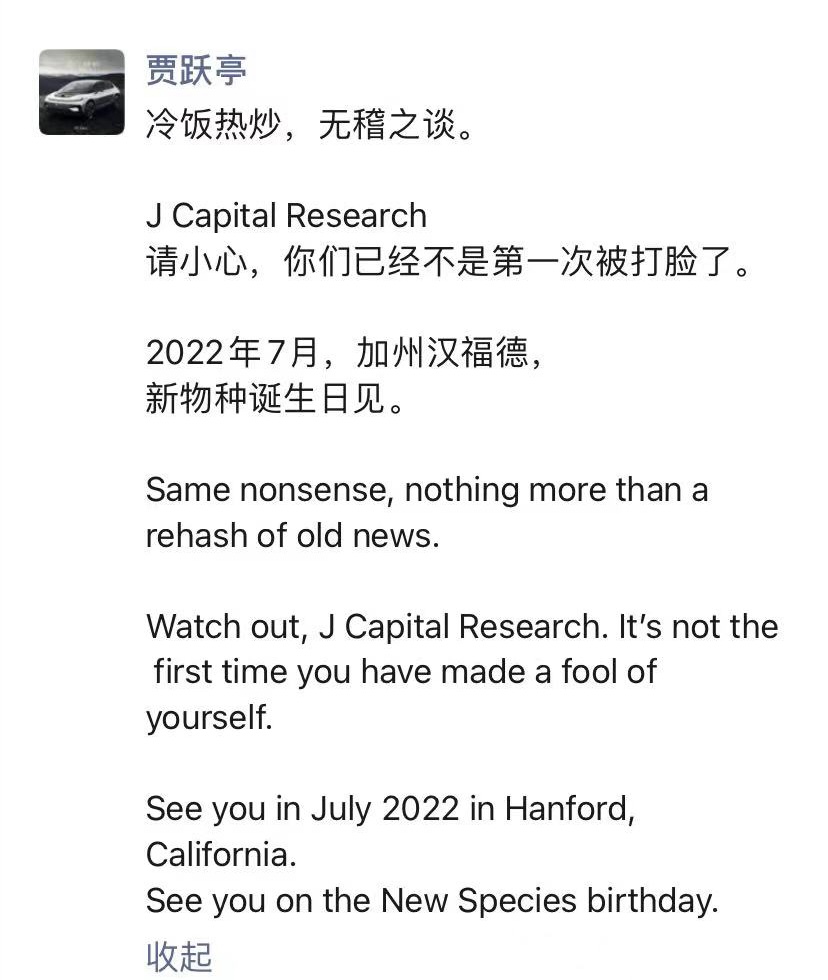 对于这份报告,贾跃亭本人在朋友圈回应称其为“冷饭热炒,无稽之谈”,称该机构已不是第一次被打脸,强调“2022年7月,加州汉福德,新物种诞生日见”。