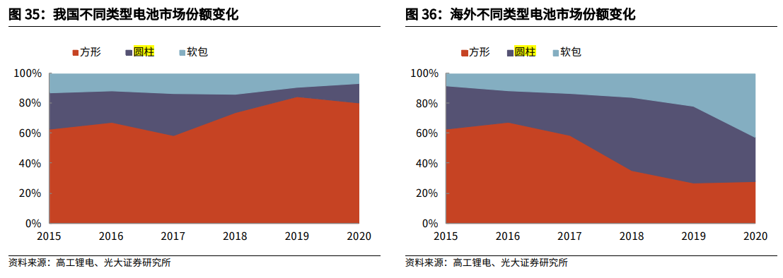 值得注意的是,在国内圆柱电池并非市场主流,方形电池占据了主导地位。光大证券研报显示,2020年我国方形电池市场份额约在80%左右。不过对比国外,圆柱电池的市场份额明显大于国内。