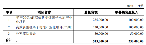 分项目来看,年产20亿AH高效新型锂离子电池产业化项目投资总额为23.50亿元,建设周期为15个月。预计达产后可实现年均营业收入33.93亿元,年均净利润4.99亿元,税后静态回收期为6.56年。