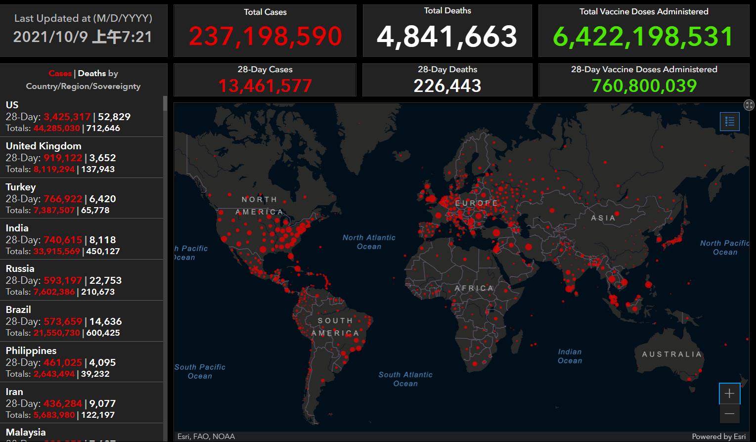 据约翰·霍普金斯大学的疫情追踪数据,截至北京时间10月9日上午8点,全球累计确诊新冠肺炎病例237198590例,累计死亡4841663例,接种疫苗超64.2亿剂次。