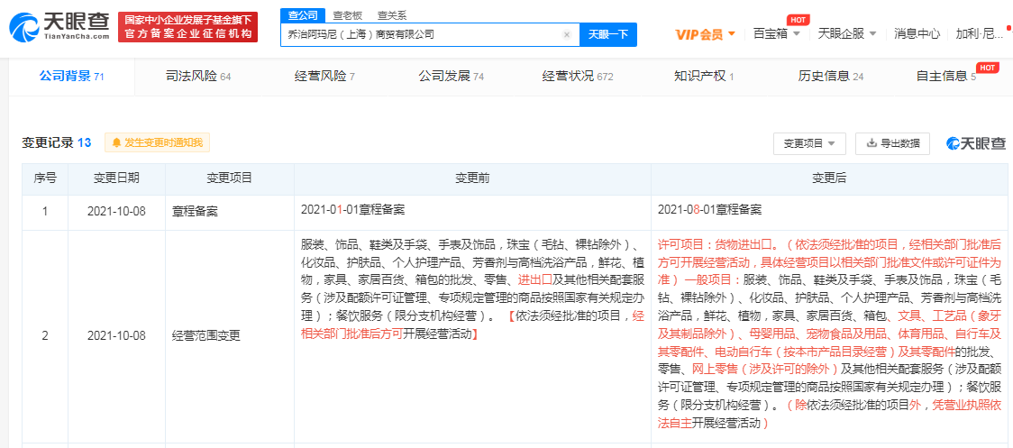 据天眼查APP显示,10月8日,乔治阿玛尼(上海)商贸有限公司发生工商变更,经营范围新增货物进出口;文具、工艺品、母婴用品、宠物食品及用品、体育用品、自行车及其零配件、电动自行车及其零配件的批发、零售;网上零售等。该公司成立于2006年8月,法定代表人为MARSOCCI GIUSEPPE,注册资本4840万美元。