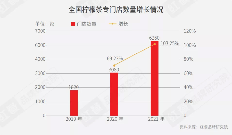 柠檬茶在2021年迎来了大爆发,门店数量也是直线攀升。红餐品牌研究院预估,到2021年底,全国的柠檬茶专门店数量有望超过6000家。而这一数值在2020年也还只是3000多家。