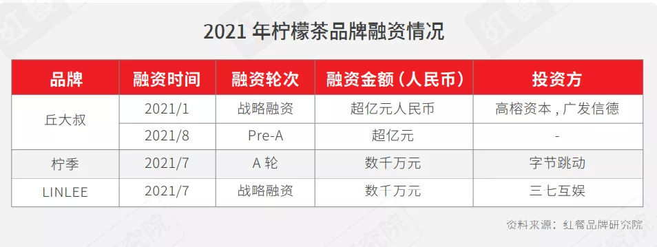 柠檬茶火了,资本自然不会错过这个机会。红餐品牌研究院统计发现,光是 2021年,柠檬茶赛道就涌现出了4笔融资事件。